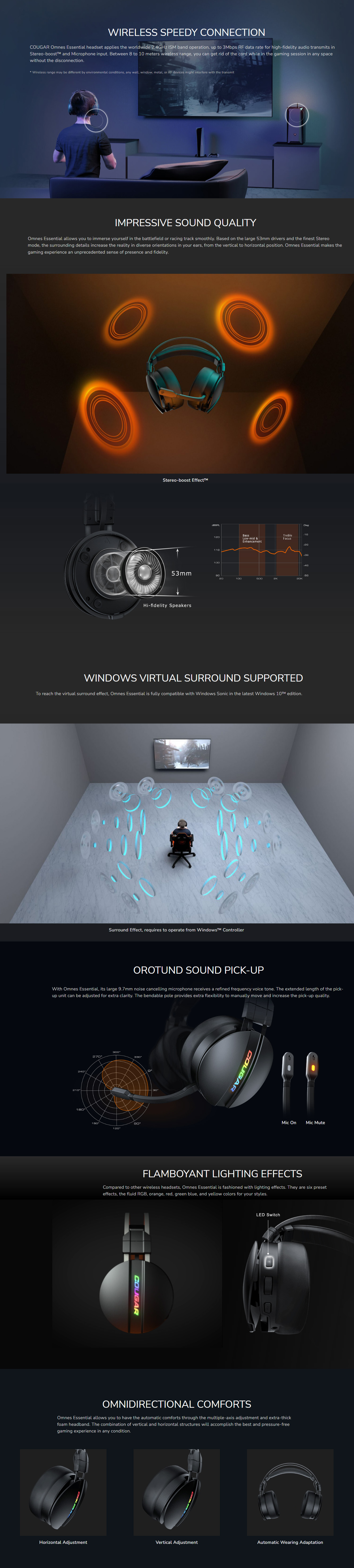 COUGAR Omnes Essential is a wireless headset with an enhanced stereo driver and microphone for energizing your gaming performance. It is your best wireless teammate.
