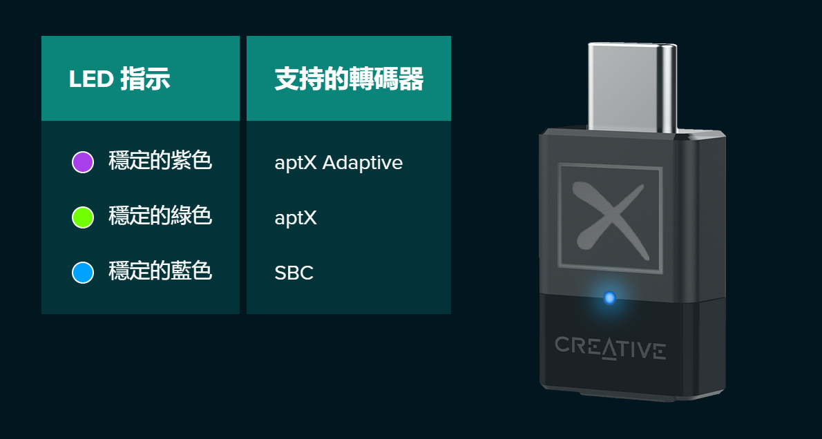 2 在 HFP 模式下,Creative BT-W4 允許您使用無線耳機的麥克風進行語音聊天,但高級 A2DP 藍牙轉碼器(aptX Adaptive、aptX 和 SBC)將無法使用。