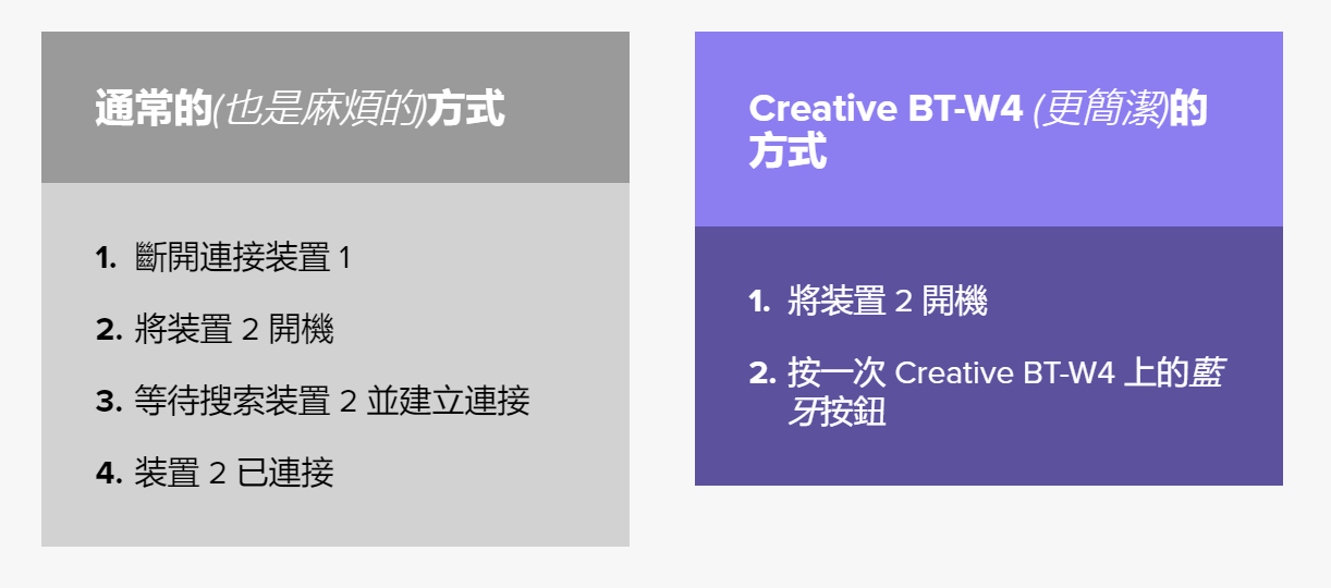 Creative BT-W4 上直觀的装置切換功能使您只需按一下按鈕,即可輕鬆切換所連接的輸出装置。