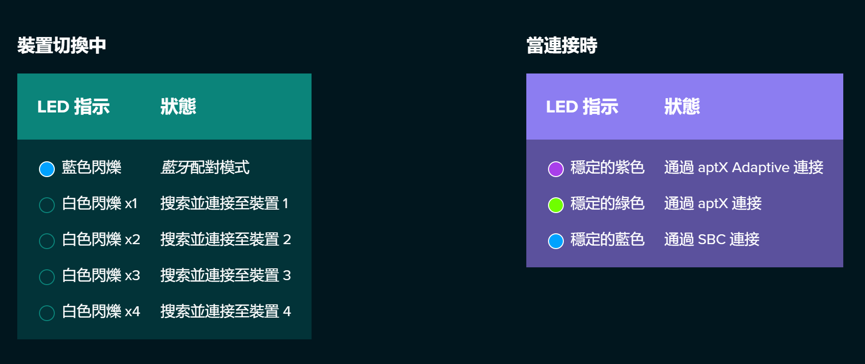 | 支持的編解碼 | aptX Adaptive, aptX, SBC | aptX Low Latency, aptX HD, aptX, SBC |