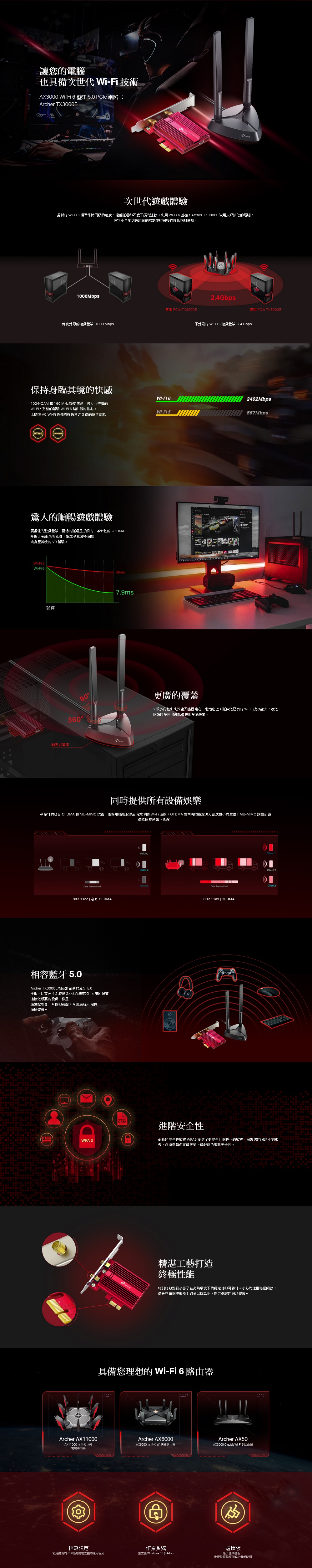 • 無與倫比的Wi-Fi 6速度 – 打破gigabit 障礙以及高達 2402 Mbps (5 GHz) + 574 Mbps (2.4 GHz)。