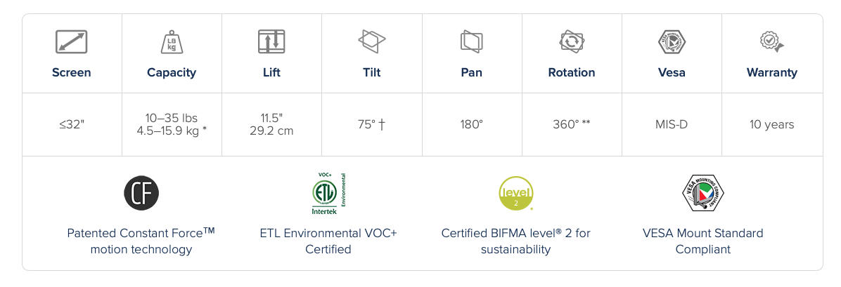 - * Weight Capacity: Individual LCD weight = 5–17.5 lbs (2.3–7.9 kg) per monitor. Total LCD weight = 10–35 lbs (4.6–15.8 kg). Monitor depth greater than 3" (7.5 cm) may diminish capacity