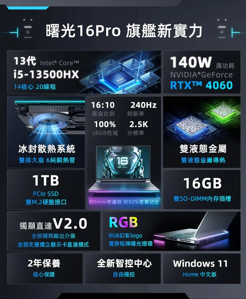 - 16" IPS screen, 2560 x 1600 (QHD), 240Hz Refresh Rate, 500 nits, 100% sRGB color gamut