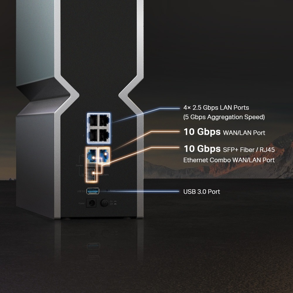 | 網路孔 | • 1× 10 Gbps WAN/LAN§ • 1× 10 Gbps SFP+/RJ45 Combo WAN/LAN§ • 4× 2.5 Gbps LAN |