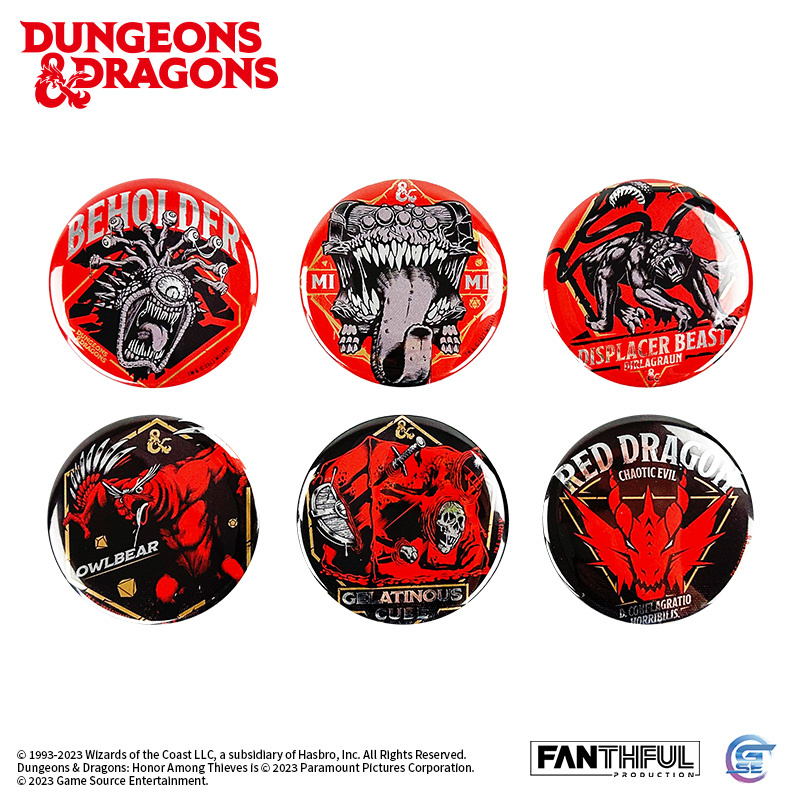 選取了玩家們熟悉的經典怪物形像作為素材,組合出了這樣一組風格獨特徽章套組。其中好幾隻也在上半年的電影中,有著精彩的表現。六枚徽章款式分別為:眼魔、擬態怪物(寶箱怪)、四岐蛇豹、梟熊、凝膠怪以及紅龍。每一枚上不僅有咄咄逼人的怪物圖案還有對應名字及線條的小點綴。