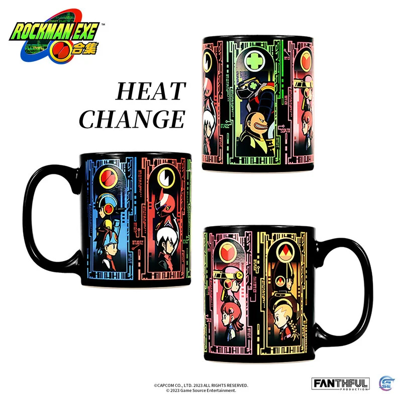 黑色的杯身上,普通狀態為五位角色對應的圖標及邊框;而加入熱水後,水杯會因高溫發生顏色改變,呈現出熱斗&洛克人、伊集院炎山&布魯斯、迪卡歐&氣力人、櫻井美露&蘿露、雅伊朵&葛萊德,五位角色及領航員的圖案。
