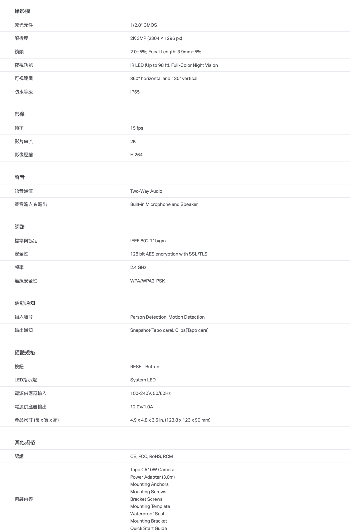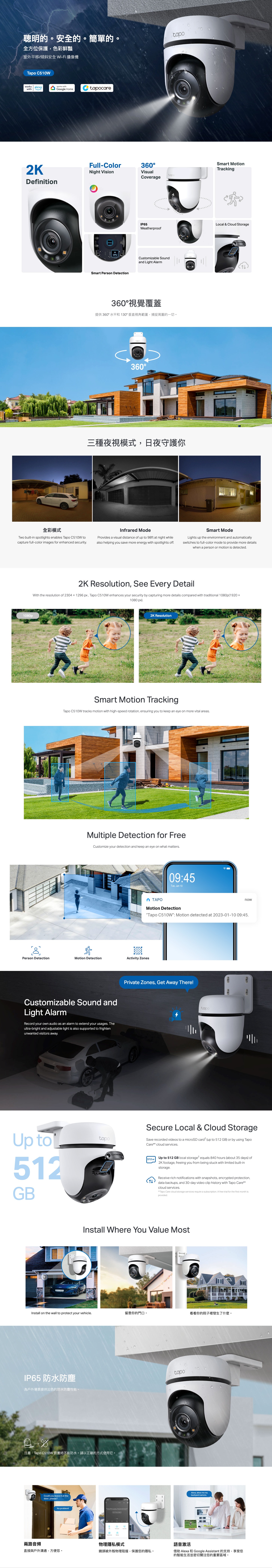 - 2K 分辨率- Tapo C510W 的分辨率為 2304 × 1296 像素,與傳統 1080p(1920 × 1080 像素)相比,可以捕獲更多細節,從而增強您的安全性。