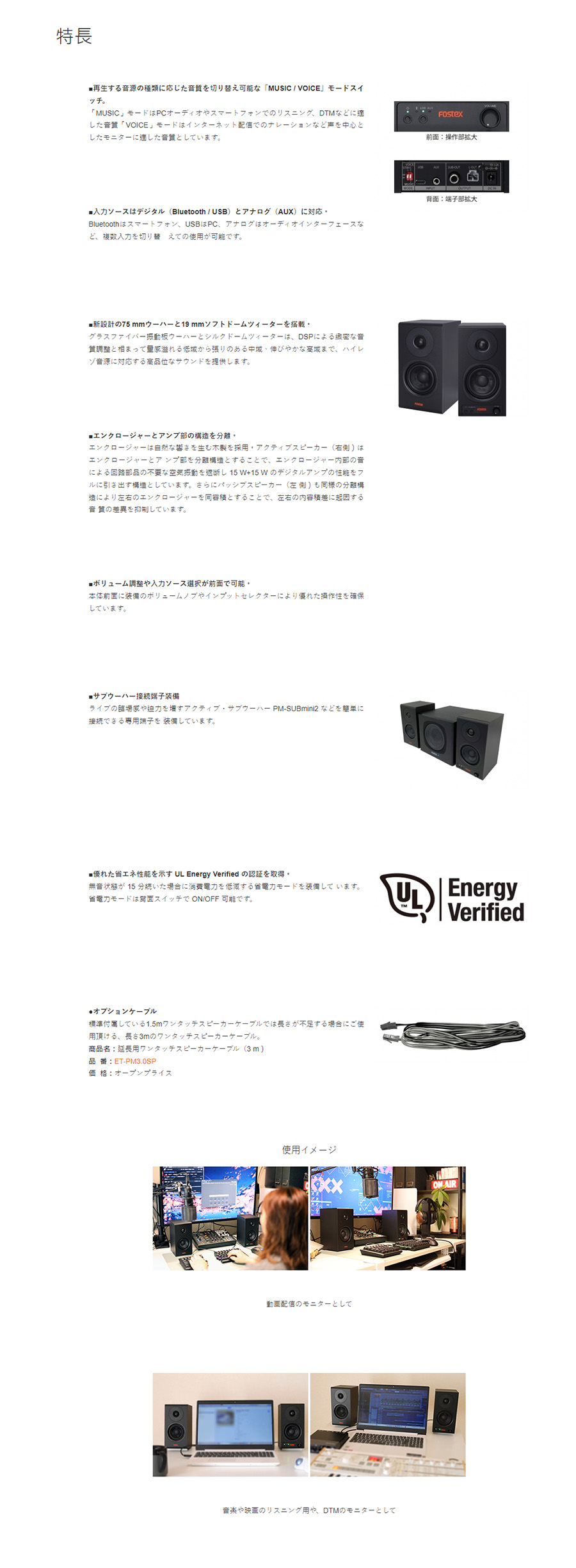 - 本機正面的音量旋鈕和輸入選擇器確保了出色的可操作性。配備專用端子,可讓您輕鬆連接PM-SUBmini2等主動式低音炮,從而增加現場表演的臨場感和力量。配備省電模式,15分鐘無聲音時可降低耗電量。可透過背面的開關開啟/關閉省電模式。