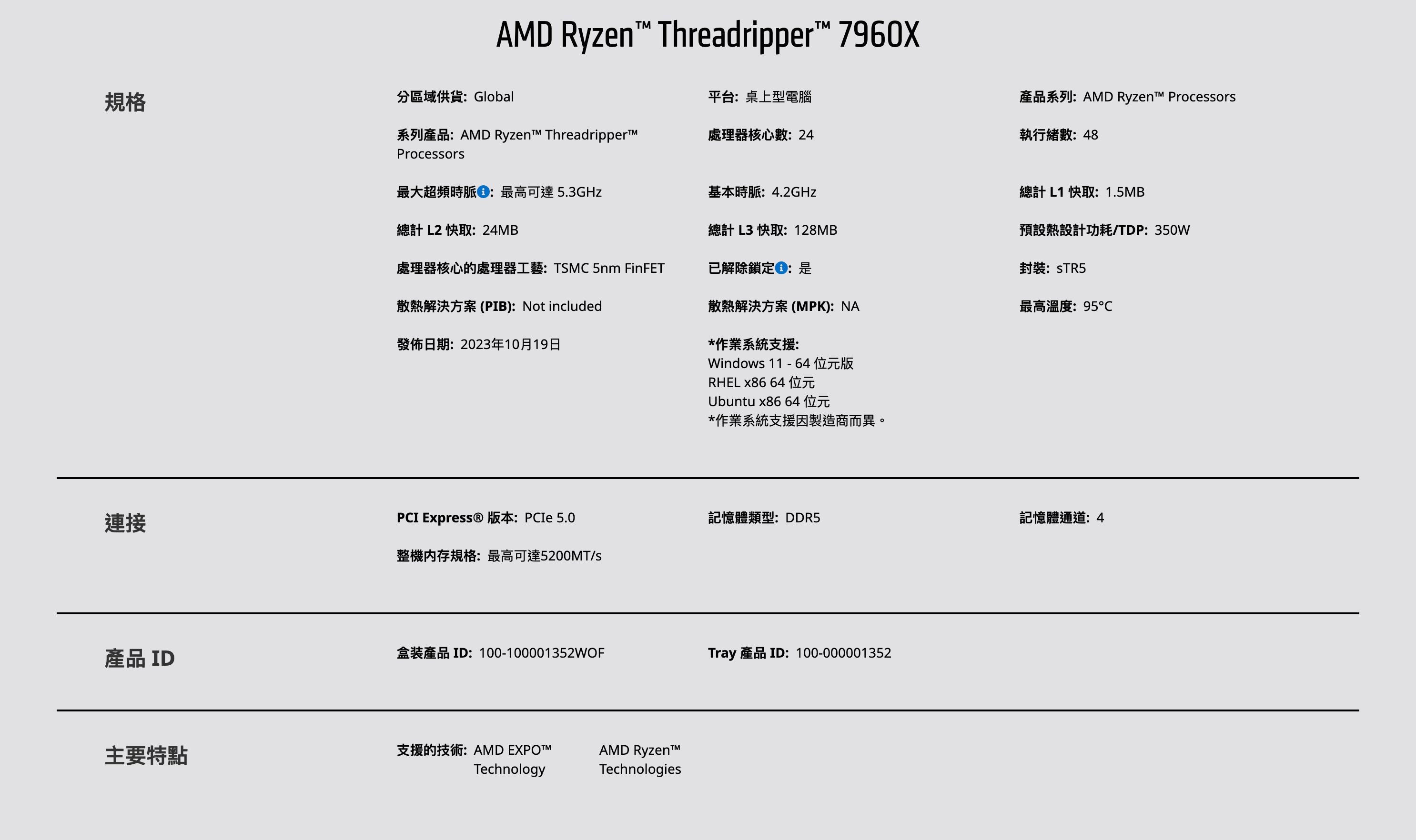 AMD Ryzen Threadripper 7960X 處理器(24C48T/120MB/5.3Ghz)