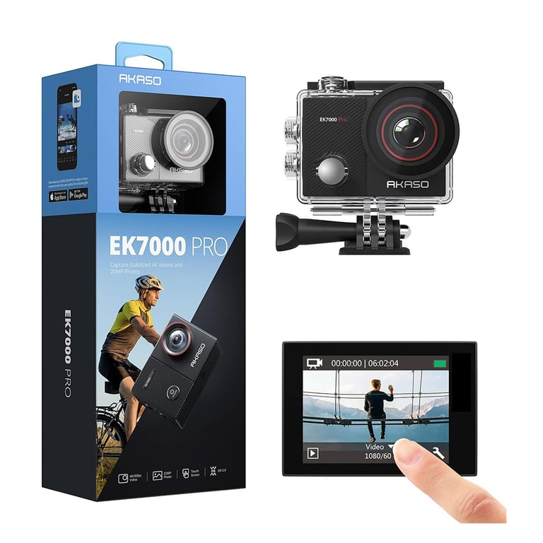 - 98 Feet waterproof camera. AKASO EK7000 is designed to withstand extreme environments, together with durable waterproof case. With the accessories, transform it for indoor and outdoor activities.