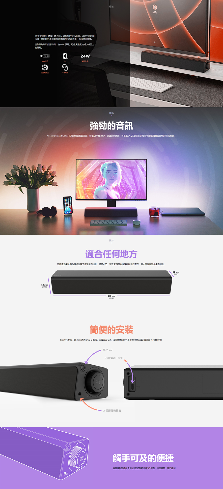 - Creative Stage SE mini 通過 USB-C 供電,支援藍牙 5.3。只需將條形喇叭直接連接至支援的裝置即可開始使用!