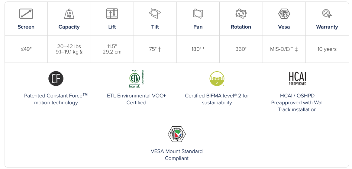 - Offers ergonomic monitor positioning using patented Constant Force™ Technology
