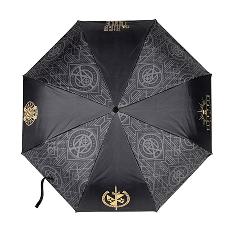 傘面上印有電影系列的多個經典元素:象徵 John Wick 的殺手代號 —— “BABA YAGA”、名台詞 “Tick Tock, Mr. Wick.”、主宰殺手界的高桌組織的 Logo 和侯爵紋章。傘套上也印有 “JOHN WICK” 字樣。
