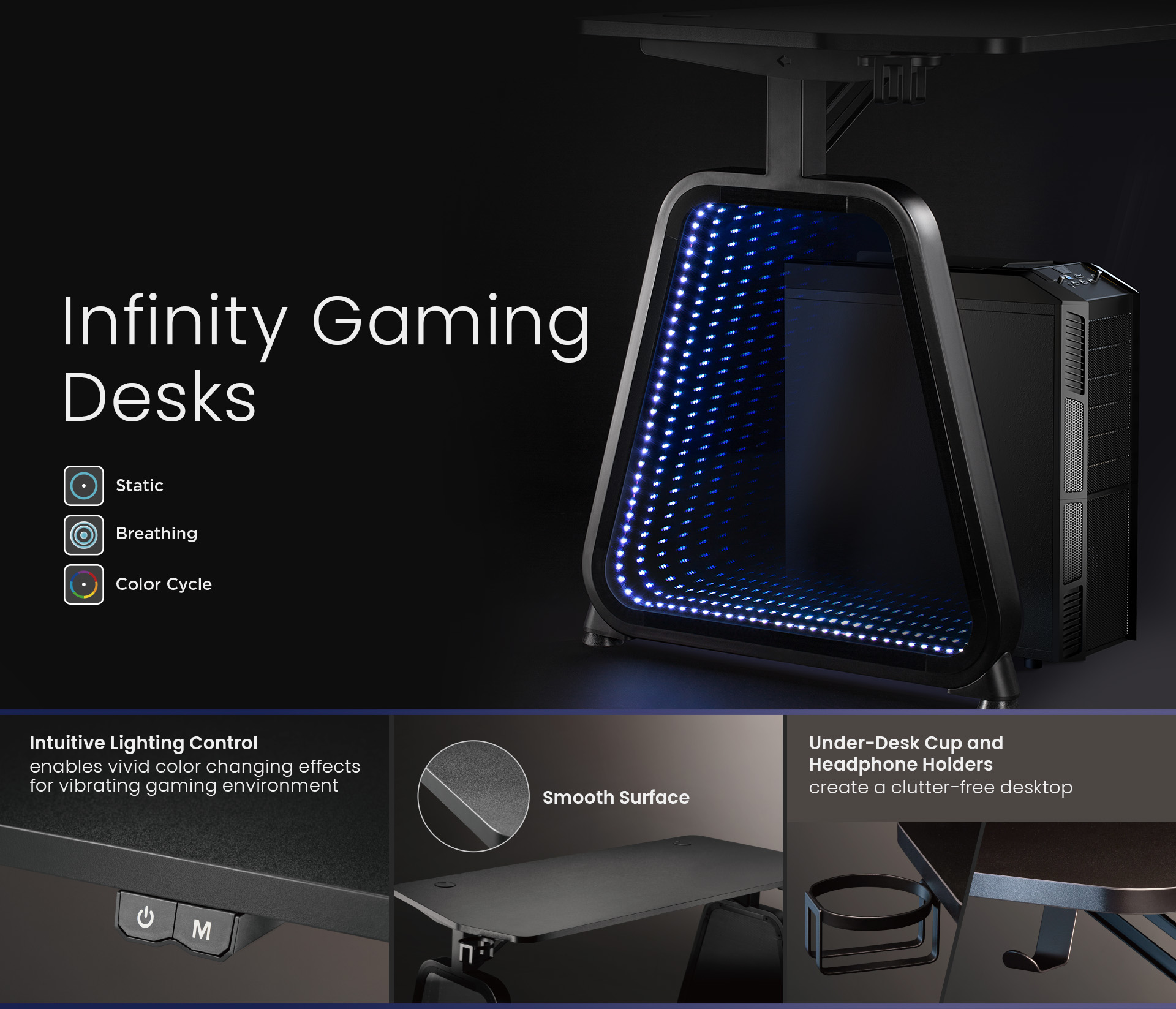 So do we. The GMD12-1D Infinity Gaming Desks redefine gaming furniture by incorporating infinity tunnel light into the legs.
