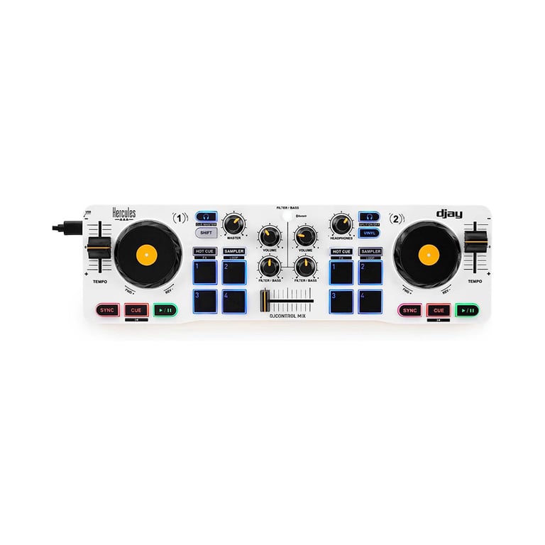 - Controls the djay app available free of charge and for unlimited use on Android and iOS (no need to pay for the app: simply close the pop-up window promoting you to upgrade to djay Pro when the app starts up).
