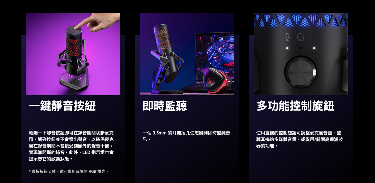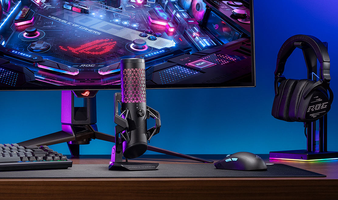 ROG Carnyx 擁有 25 mm 錄音室等級電容式膠囊單體和心形指向性收音、192 kHz / 24 位元取樣率、高通濾波器、內建防噴網罩、優質金屬減震架,以及 ASUS Aura Sync RGB 燈光。