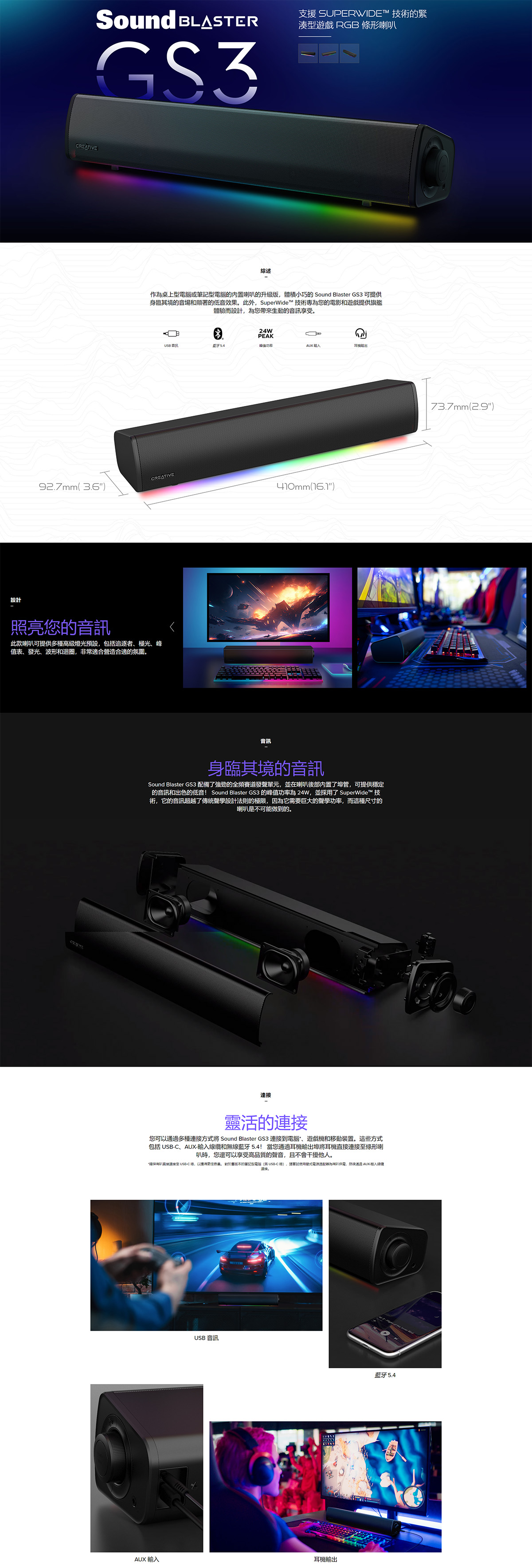 作為桌上型電腦或筆記型電腦的內置喇叭的升級版,體積小巧的 Sound Blaster GS3 可提供身臨其境的音場和顯著的低音效果。此外,SuperWide™ 技術專為您的電影和遊戲提供旗艦體驗而設計,為您帶來生動的音訊享受。