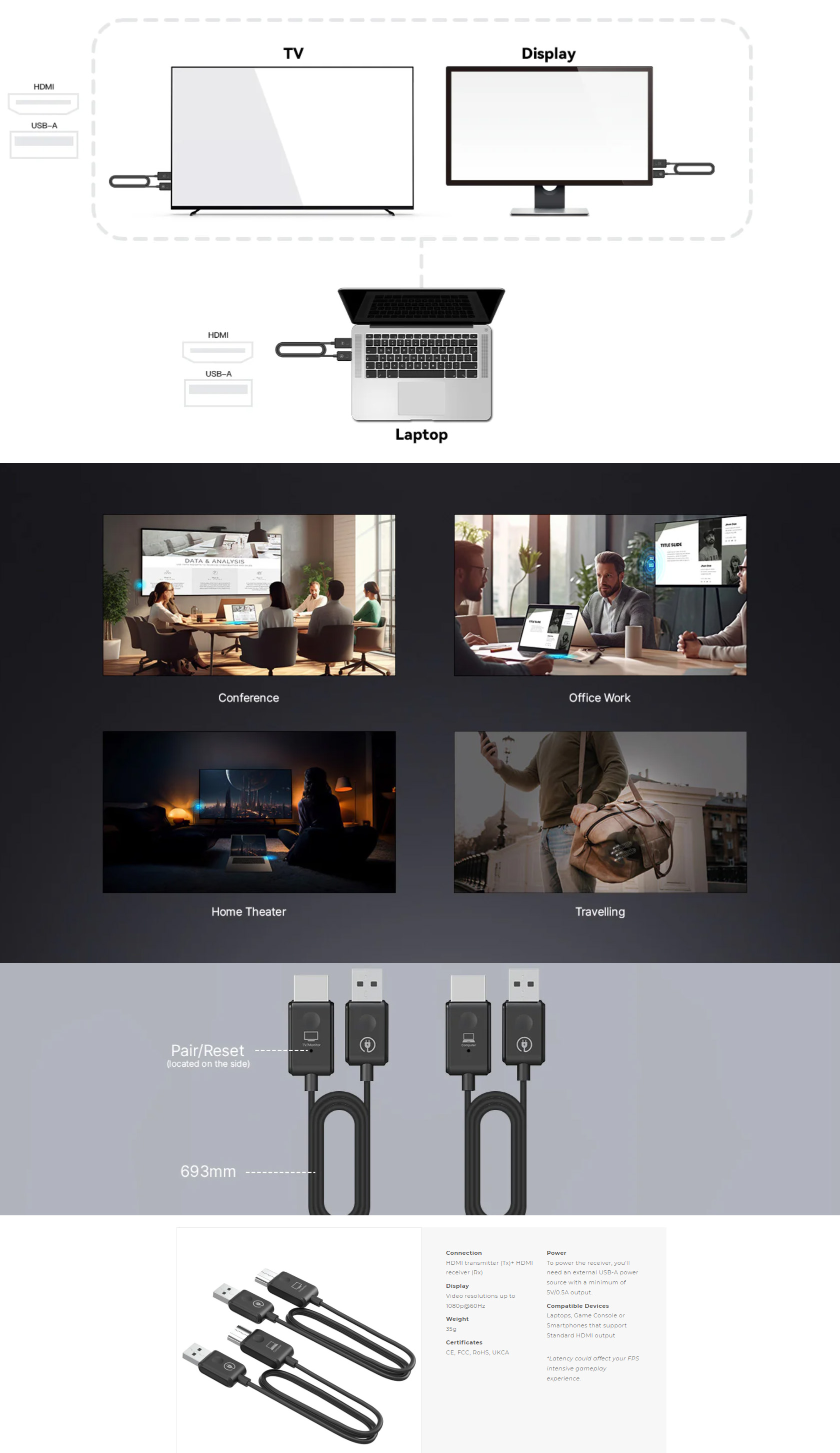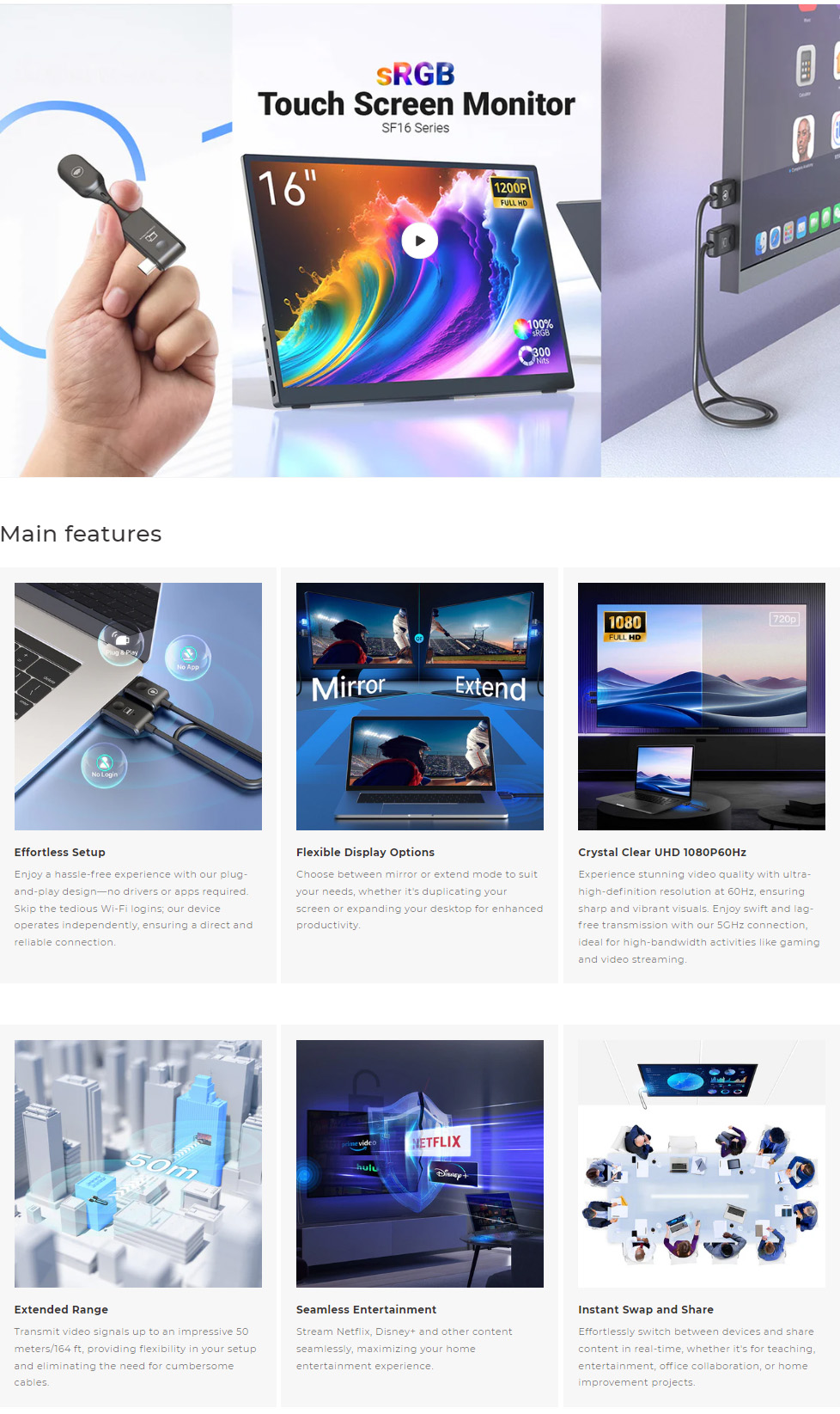 Introducing the H1, the groundbreaking HDMI to HDMI Dongle Transmitter and Receiver that redefines connectivity. With a plug-and-play setup, this dongle requires no drivers or apps, ensuring a seamless experience. Its universal compatibility spans across laptops, tablets, smartphones - offering flawless connectivity and stunning UHD 1080P 60Hz visuals. Choose between mirror or extend mode effortlessly to suit your needs. Transmitting up to 50 meters/164 ft, its compact size ensures portability without compromising functionality. Streamline entertainment with uninterrupted one-to-one transmission, bypassing Wi-Fi logins for a direct, reliable 5GHz connection. Experience instant device swapping and content sharing for teaching, gaming, or collaborative projects - ushering in unprecedented convenience and versatility.