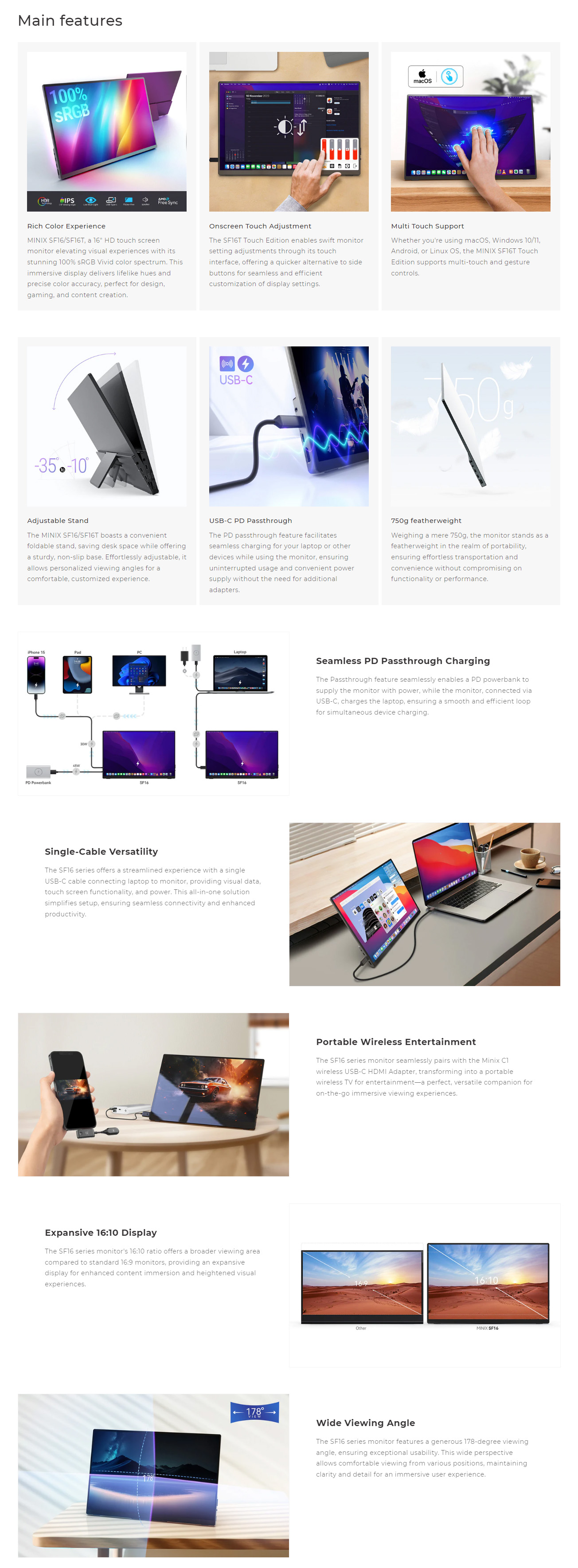 MINIX SF16/SF16T 是行動式顯示器的終極解決方案,可輕鬆擴充套件膝上型電腦和移動裝置上的內容。