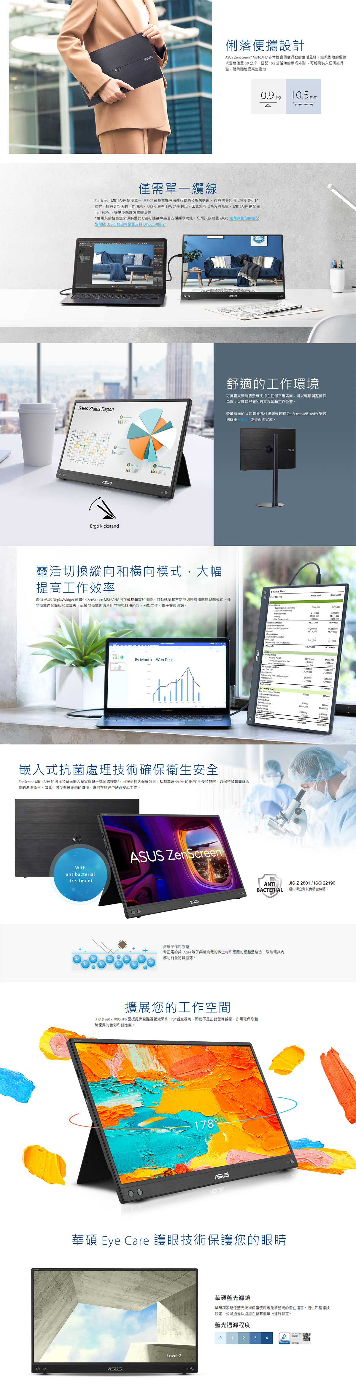 - 15.6 吋 Full HD 可攜式防眩光 IPS 螢幕採用超薄設計,可協助您在外出時更有效率地完成工作