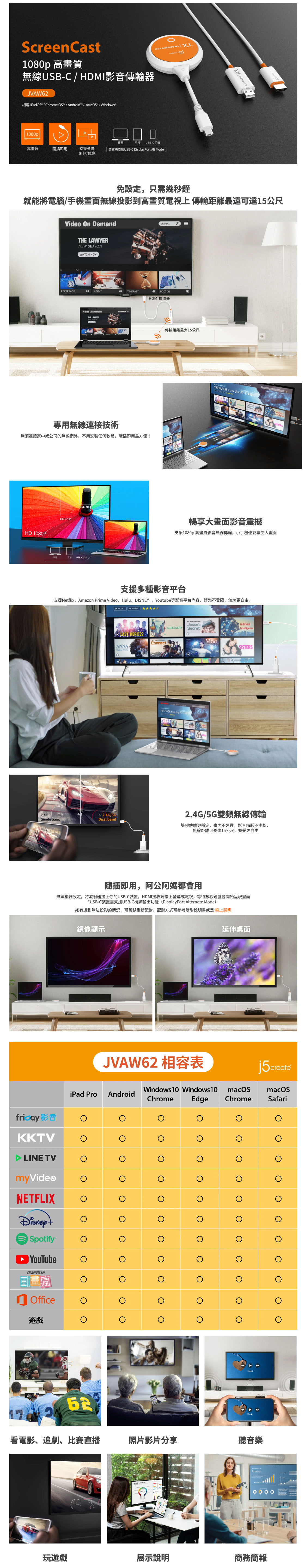 JVAW62無線影音傳輸器可將筆電、平板或手機上的畫面訊息無線發送至大螢幕,隨插即用並支援多種無線標準,