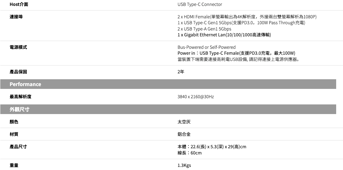 單螢幕最高可支援4K顯示,或是同時外接兩個1080p螢幕輸出,支援PD3.0 100W Pass Through充電、USB 5Gbps高速資料傳輸、網路埠,
