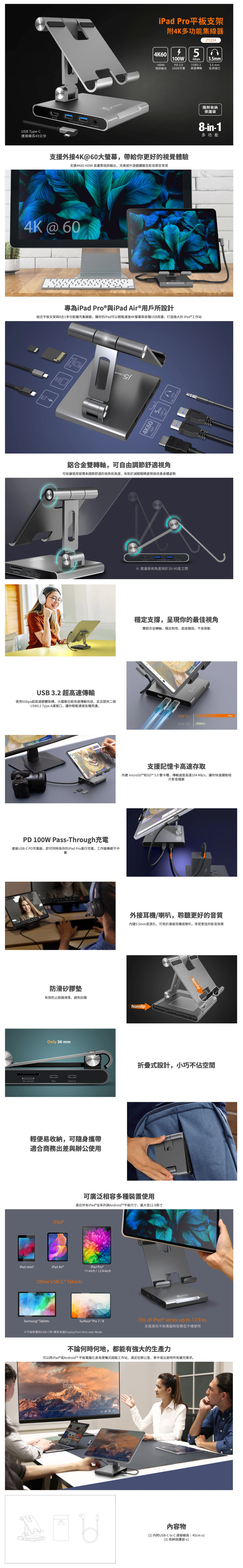 JTS224是一款專為iPad Pro®與iPad Air用戶設計,結合平板支架與8合1多功能擴充集線器,