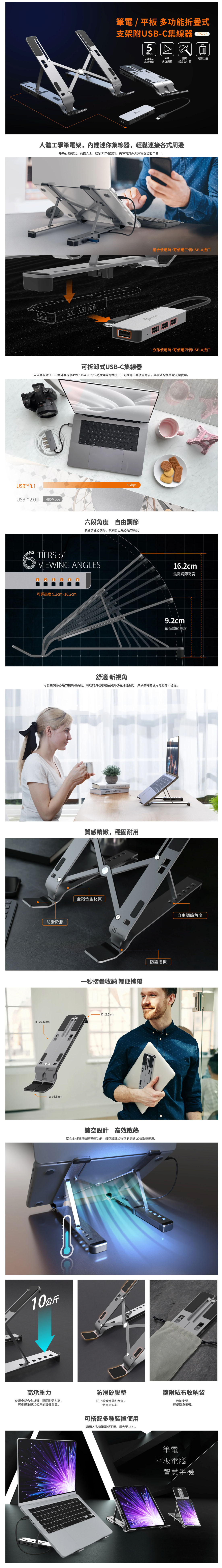 筆電支架本體採鋁合金材質,輕鬆折疊式設計,可一秒摺疊,輕便攜帶不占空間,並配備可拆卸式USB-C集線器,