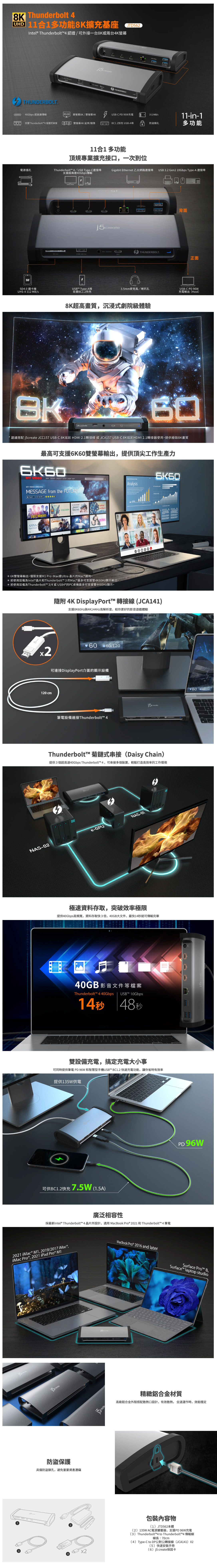 JTD562具備三個Thunderbolt™4連接埠、三個支援10Gbps的USB-A埠、一個支援BC快充USB-A埠、SD4.0讀卡機、一個3.5mm麥克風/喇叭孔、一個Gigabit網路孔,