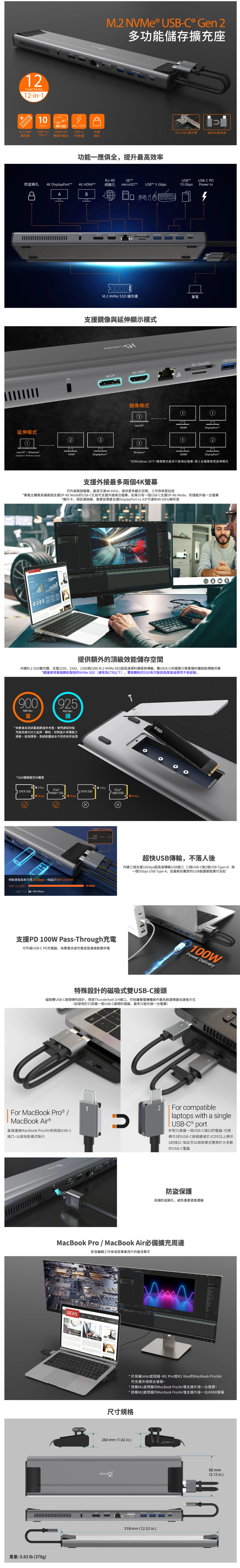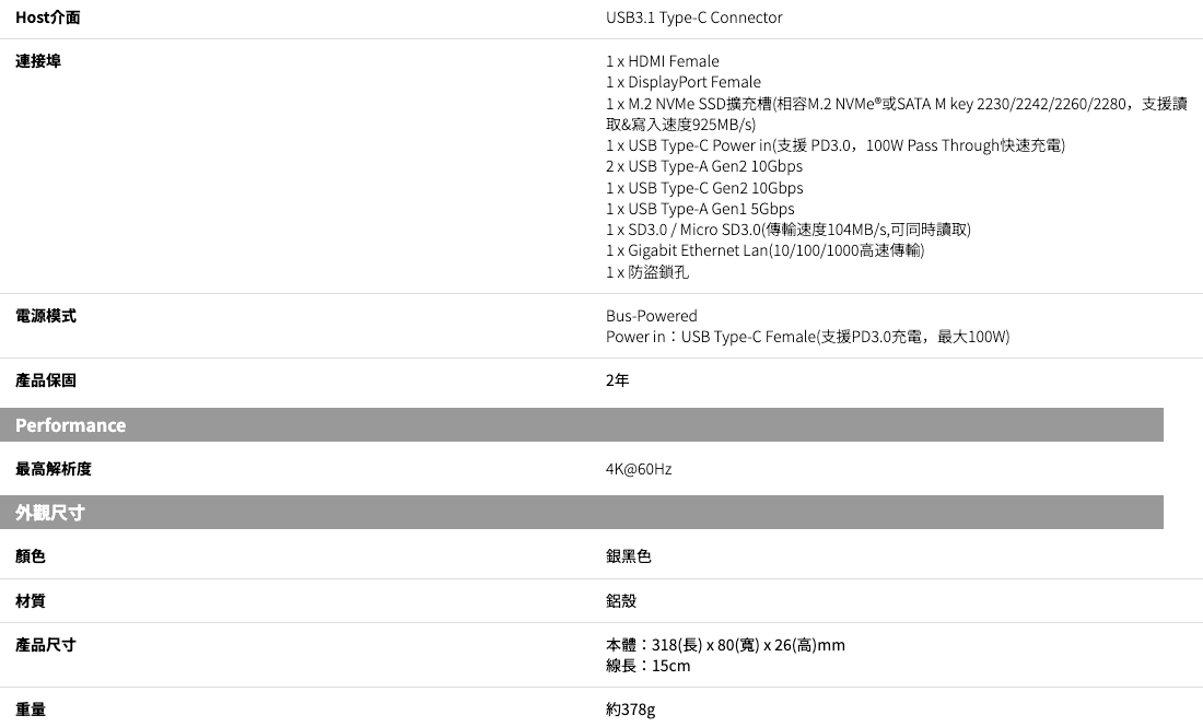 支援雙4K@60Hz螢幕輸出、PD 100W充電、10Gbps USB超高速資料傳輸、SD / MicroSD讀卡、RJ-45高速網路,
