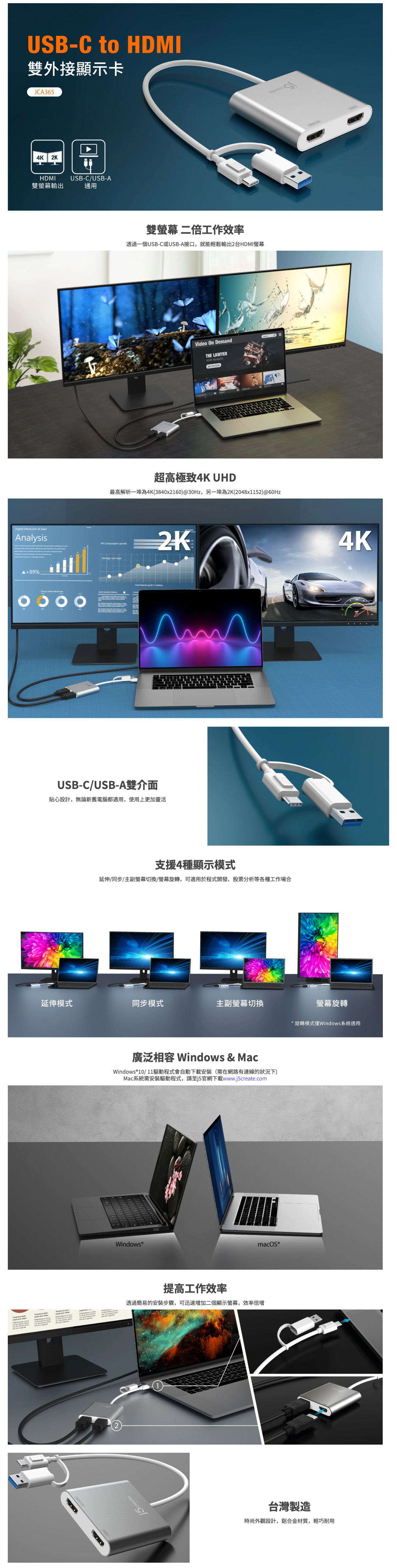 就能讓 MAC或Windows筆電,輕鬆外接2台HDMI螢幕。四種顯示模式(延伸/同步/主副畫面切換/旋轉)再加上USB-C/USB-A雙介面貼心設計,