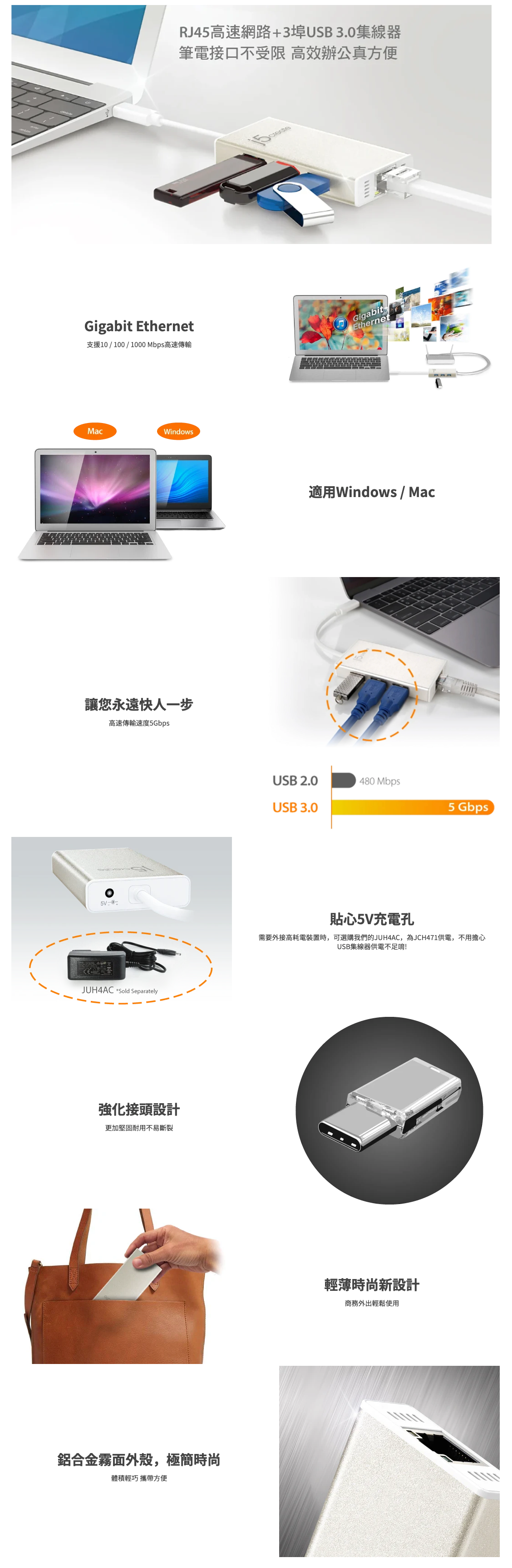 j5create JCH471 超高速外接網路卡+集線器 為最新的USB Type-C介面設計,正反兩面皆可插入,適用於具有Type-C介面的平板或筆電,