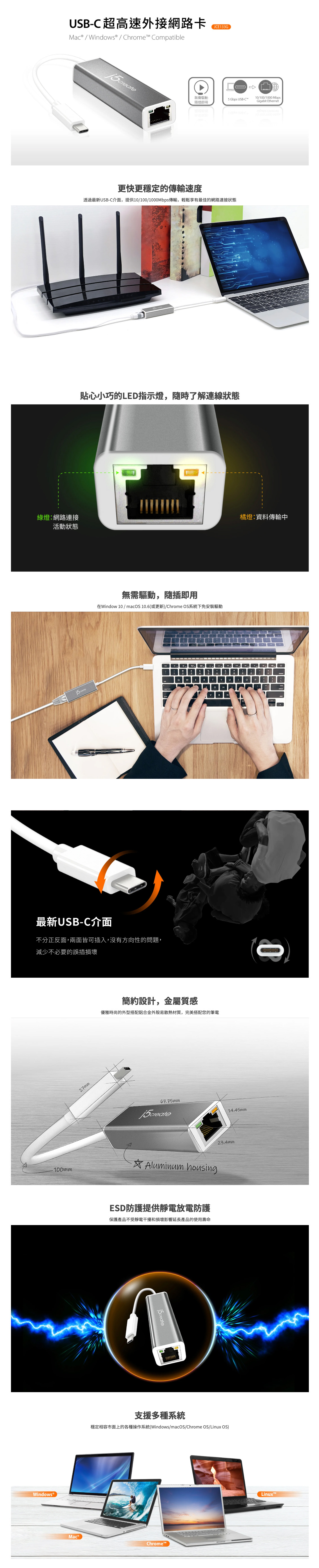 j5create JCE133G外接網路卡為最新USB Type-C介面,反兩面皆可插入,貼心LED指示燈顯示連線狀況,