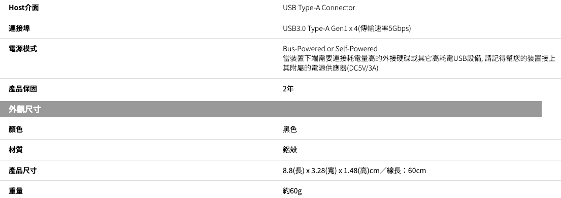 傳輸速度為5Gbps,並提供連接支援USB2.0(480Mb/秒)和1.1(12MB/s)的設備。 真正台灣製造、耐磨鋁製外殼,