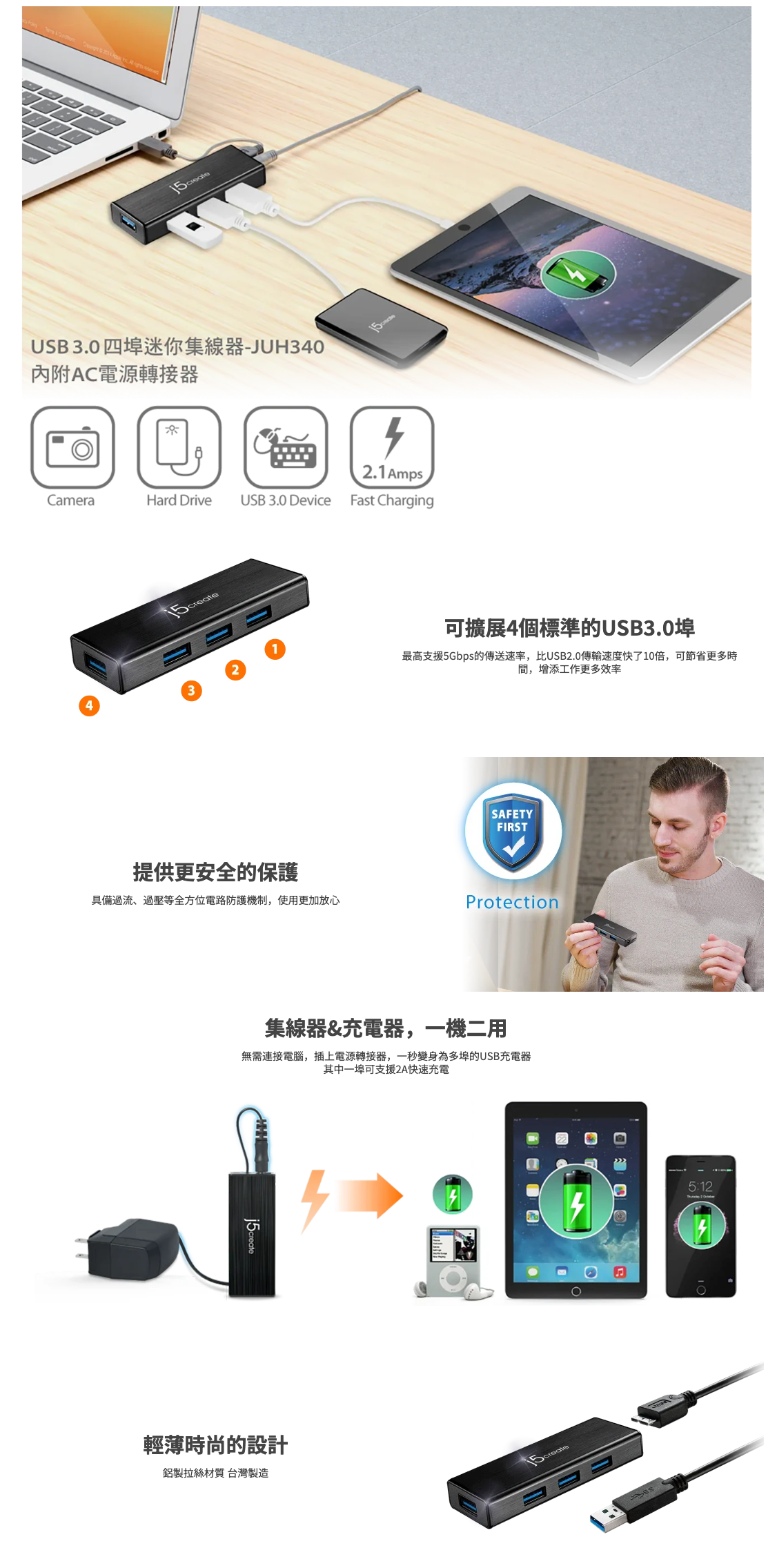 j5create USB 3.0 4埠迷你集線器,允許多達4個USB3.0設備進行連接,充電規格為2.1A,