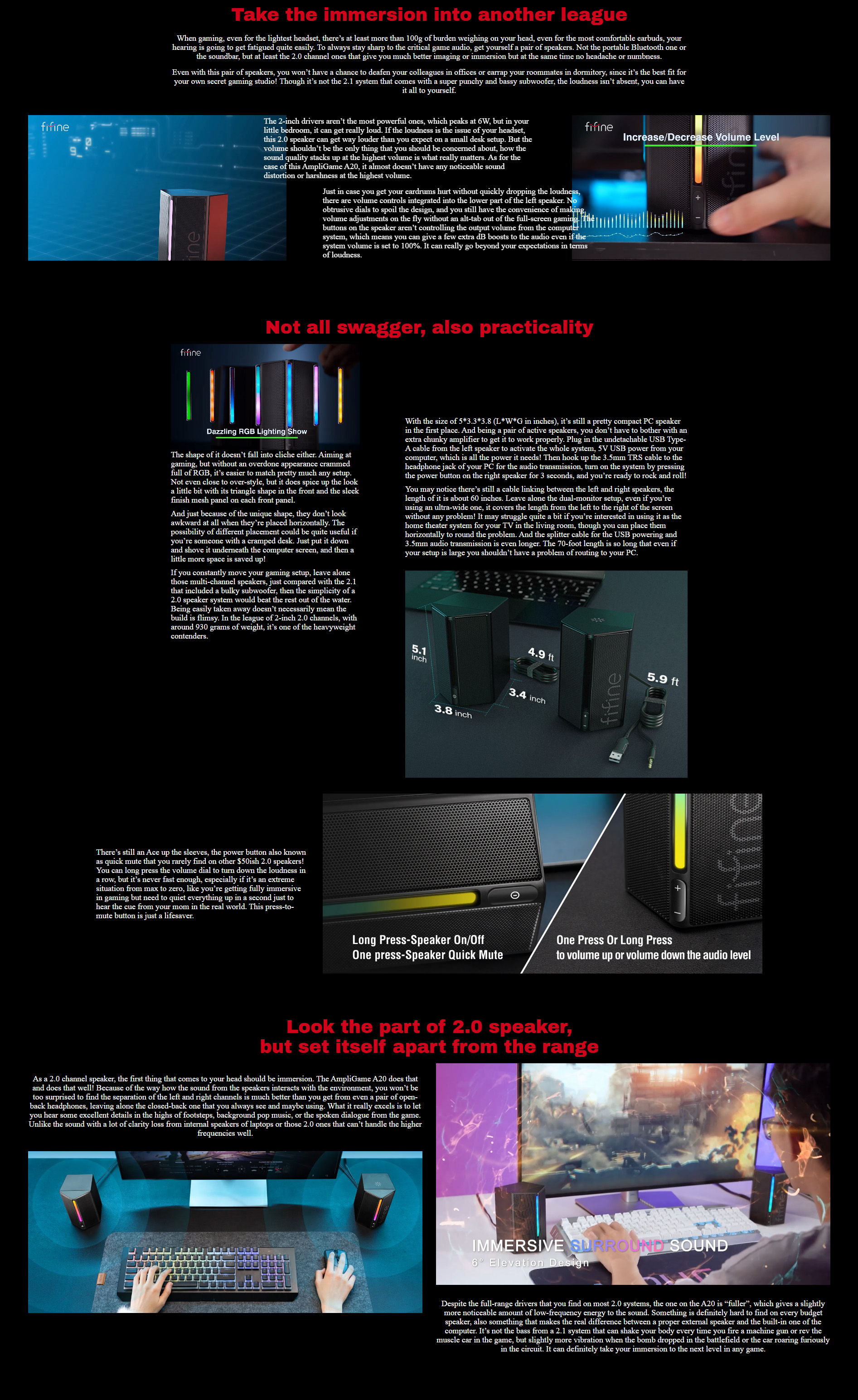 這款 AmpliGame A20 的 2 英寸驅動器並不是最強大的,峰值功率為 6W,但在你的小臥室裡,它的音量確實很大。如果你的耳機存在音量過大的問題,那麼這款 2.0 揚聲器在小書桌上的音量會遠遠超出你的預期。然而,音量並不是唯一需要關心的問題,音質在最高音量下的表現才是真正重要的。就這款 AmpliGame A20 而言,它在最高音量下幾乎沒有任何明顯的聲音失真或刺耳感。