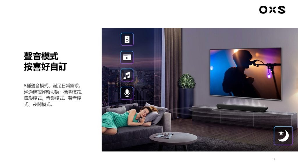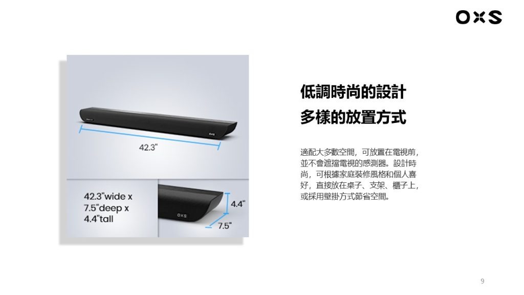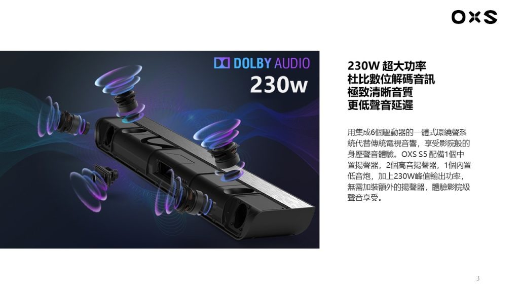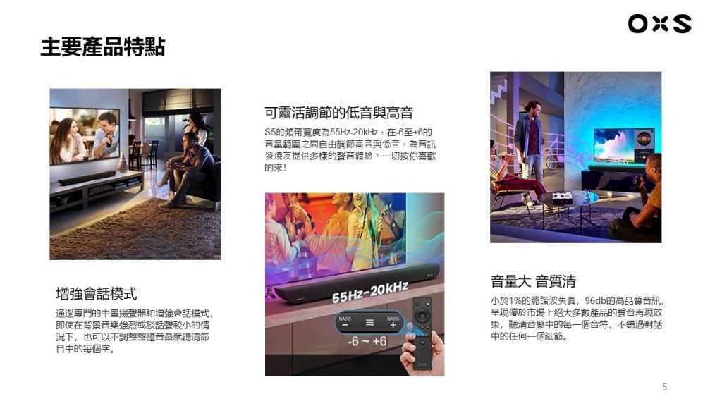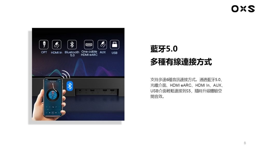 - 附設HDMI、光纖、USB、藍牙、AUX、5mm 端子,連接不同器材