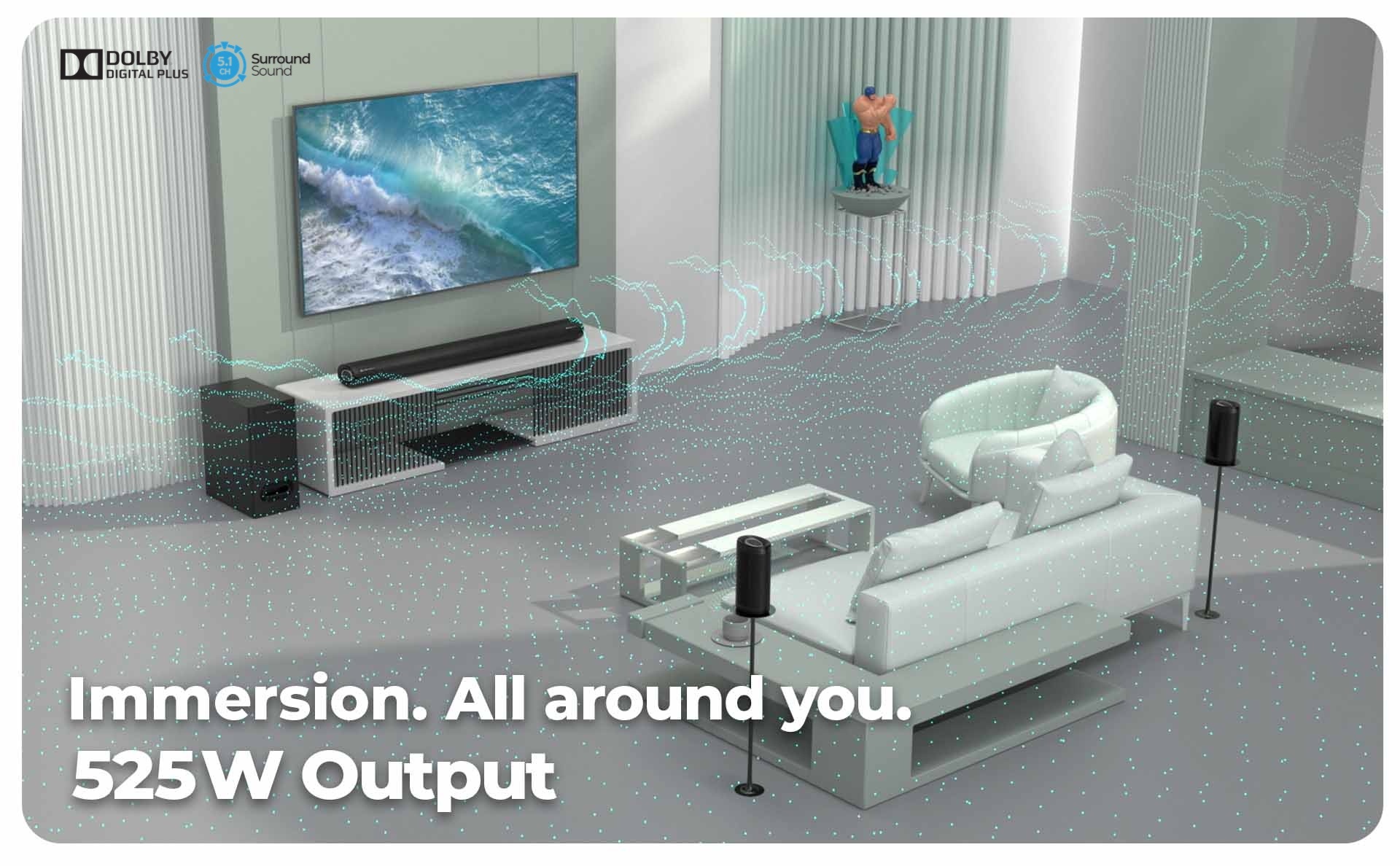 無論是沉浸在您最喜愛的電影之中,或是感受盛大比賽裡的觀眾激情,或是在自家大廳開派對聽音樂,或是觀看重要新聞報導。只需要一個搖控隨時切換劇院/運動/音樂/新聞四種模式,讓你隨時都能聽到令人驚豔的美聲。