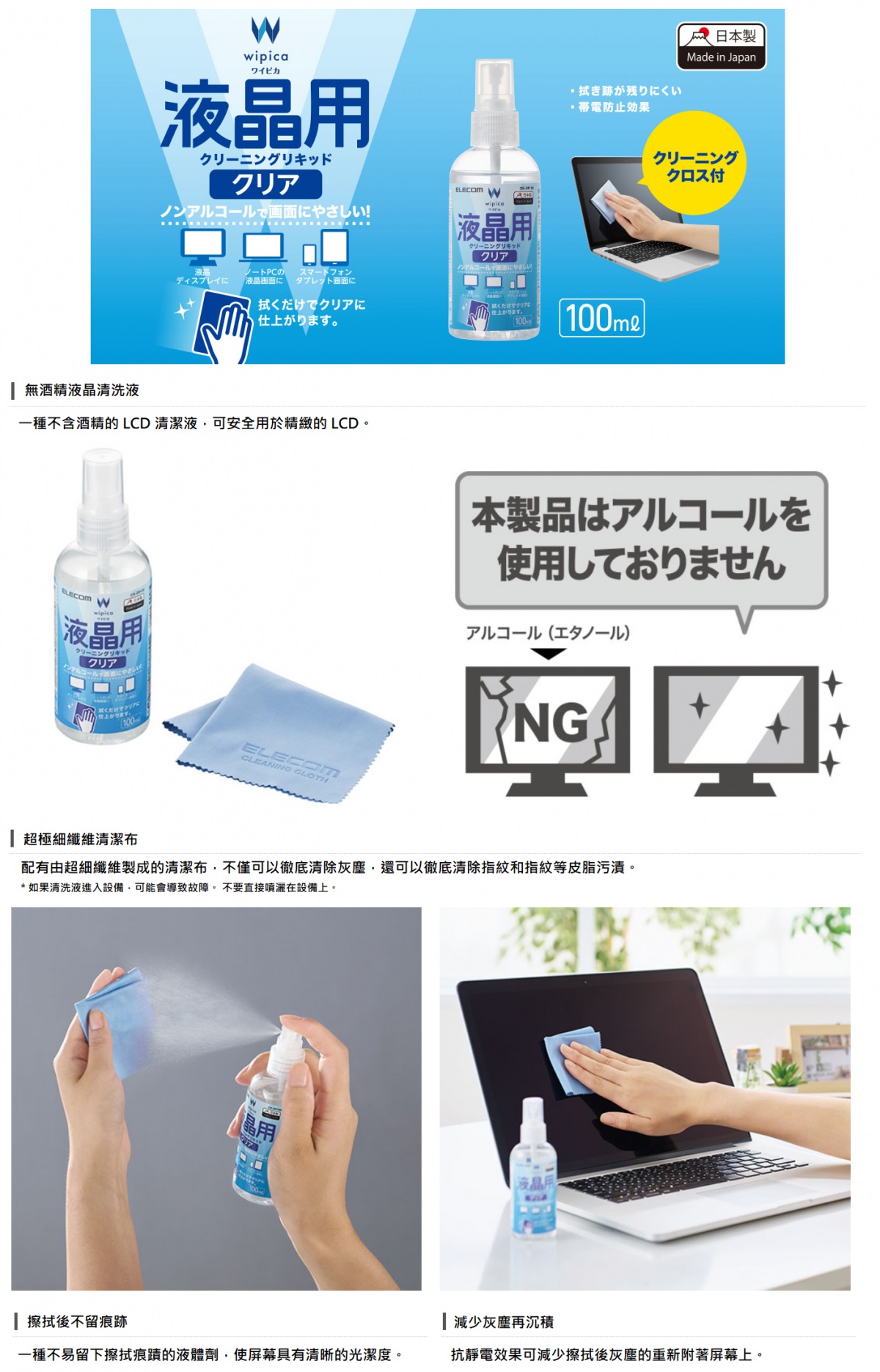 不含酒精、低刺激、不傷螢幕、一擦立即變乾淨