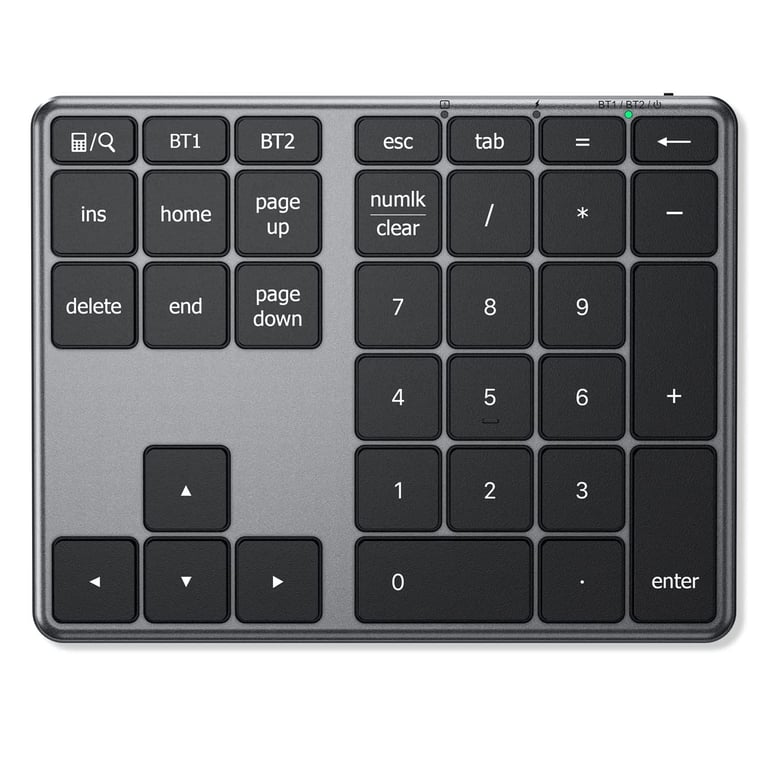 - 34 鍵數字鍵盤:通過藍牙 5.1 連接,無線數字鍵盤支持 2 個設備,易於使用。外部鍵盤包括計算器鍵、pgup、pgdn、insert 等,非常適合財務會計師、學生、辦公室專家和電子表格專家。
