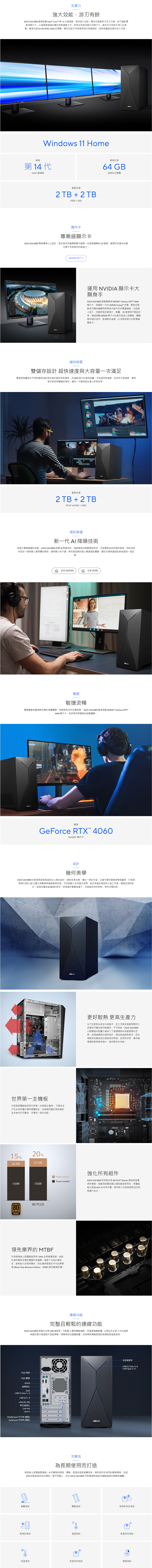 ASUS S501MER 桌上型電腦集強大效能、美學、多功能於一身,不論是電競遊戲、線上學習、內容創作、或居家辦公,都從容自如。