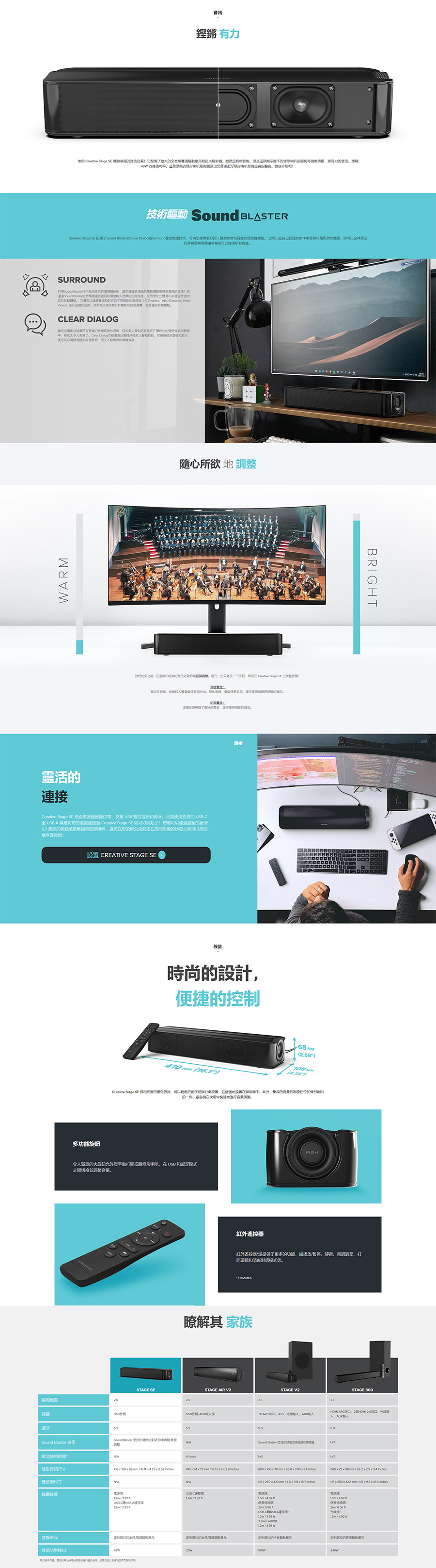 Creative Stage SE 專為娛樂和遊戲而設計,它是一款高性能的顯示器下條形喇叭,適用於電腦和遊戲機。此款時尚的條形喇叭,通過我們定制的賽道驅動單元和 Sound Blaster 技術提供強大的聲學效果,進一步增強了音質和沉浸感,與您的視覺效果相得益彰。