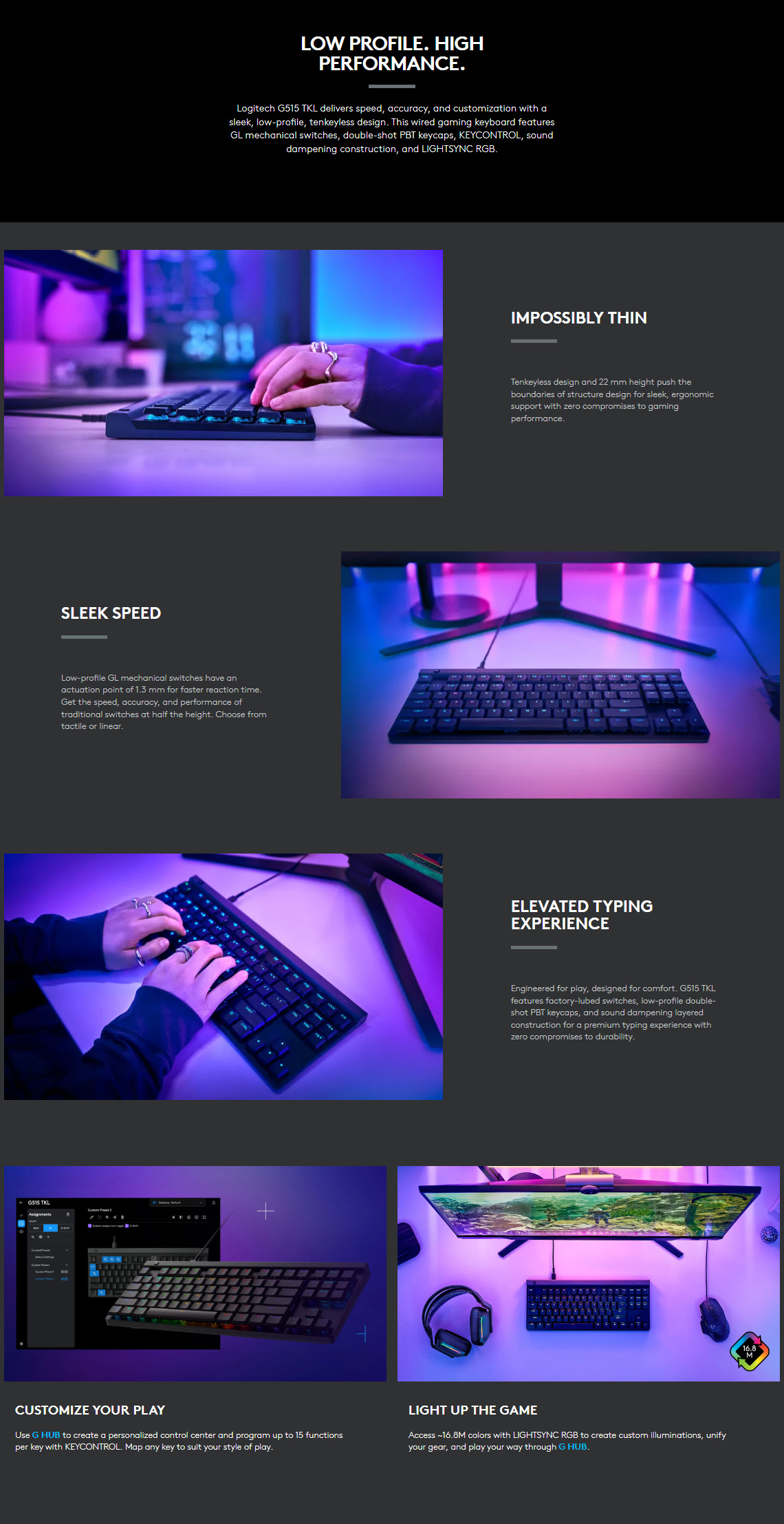 Logitech G515 TKL wired tenkeyless gaming keyboard offers high performance and low-profile aesthetic. Personalize your play with gear that is engineered to hold up to intense moments of play and designed for a finely-tuned gaming experience.