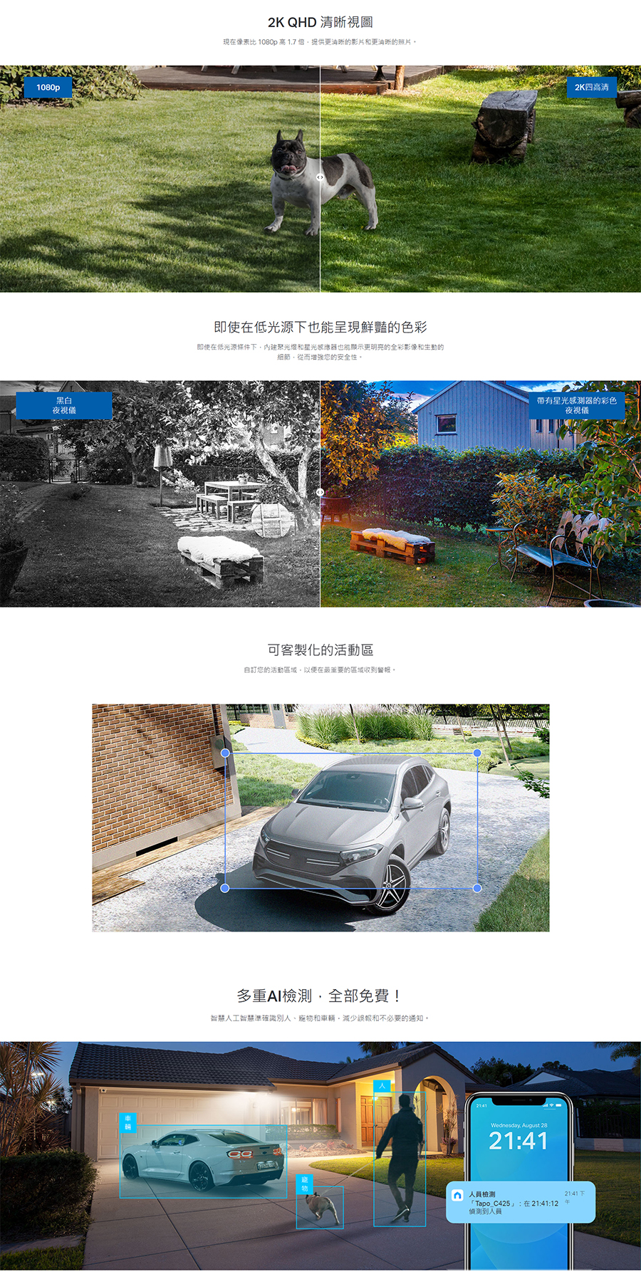 - 免費AI檢測:利用AI技術,攝影機在識別人、寵物和車輛時發出警報,減少誤報和不必要的通知。