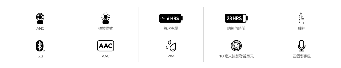 電池使用時間:高達 6 小時(ANC 關閉狀態), 總播放時間高達23小時(ANC 關閉狀態)
