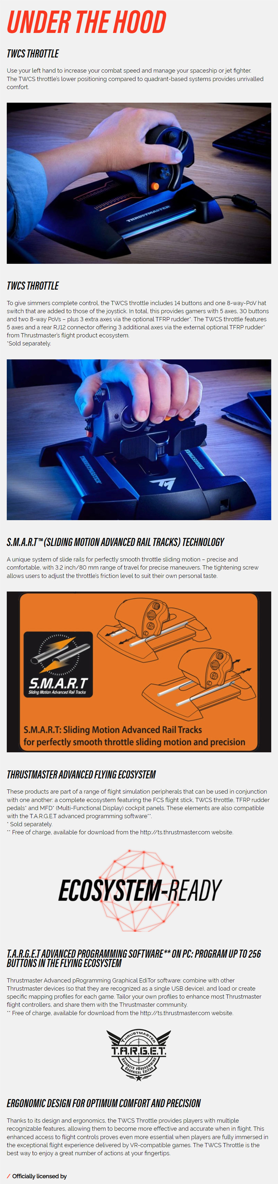 - The TWCS Throttle has been designed for advanced fliers looking for comprehensive, ergonomic, comfortable and precise throttle for a realistic in game immersion.