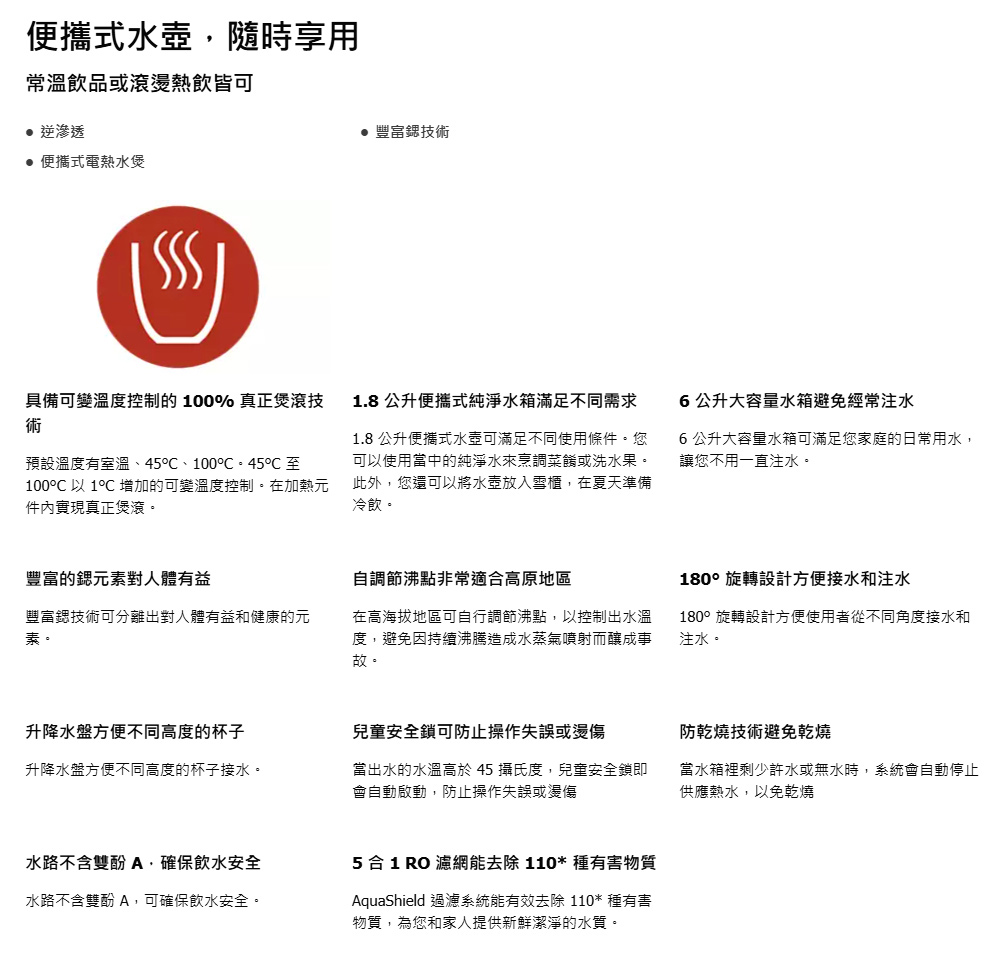 這款飲水機為您帶來更便捷的飲用體驗。100% 真煲技術,新鮮熱水觸手可及。AquaShield 過濾系統可去除 110* 種有害物質,便攜式水壺滿足不同需求