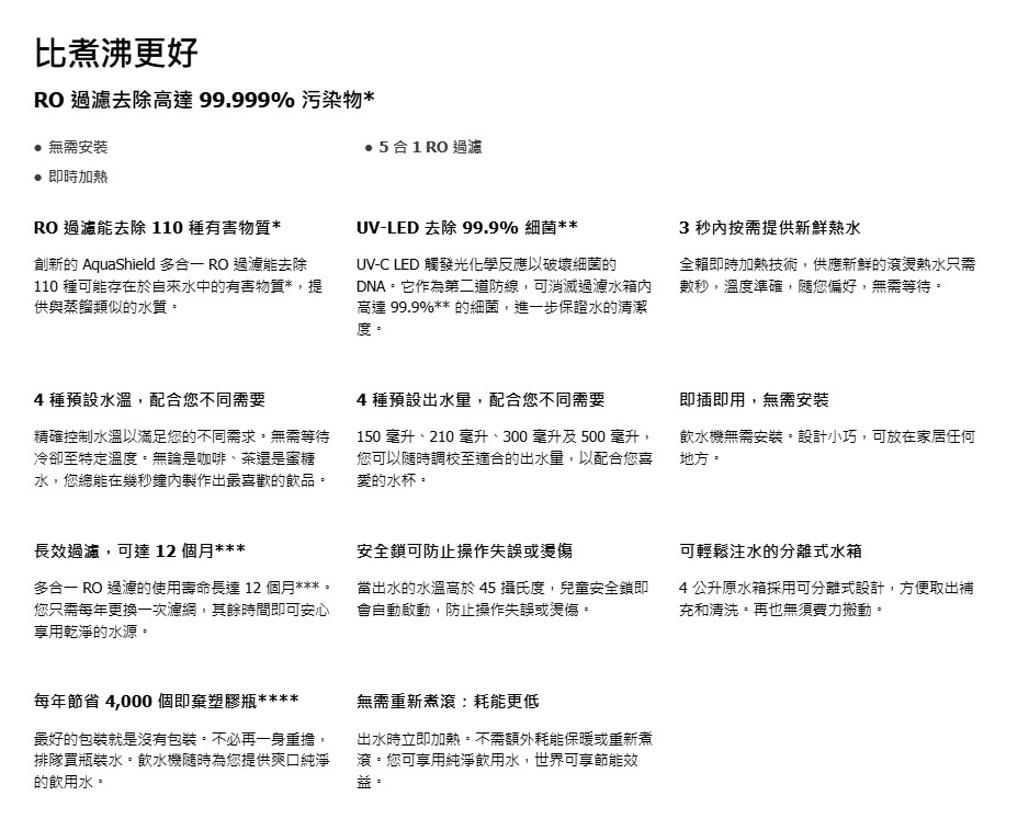 配備即時加熱技術,這款 RO 飲水機可在瞬間提供各種不同溫度的飲用水。創新的 AquaShield 多合一 RO 過濾能去除 110 種可能存在於自來水中的有害物質*。