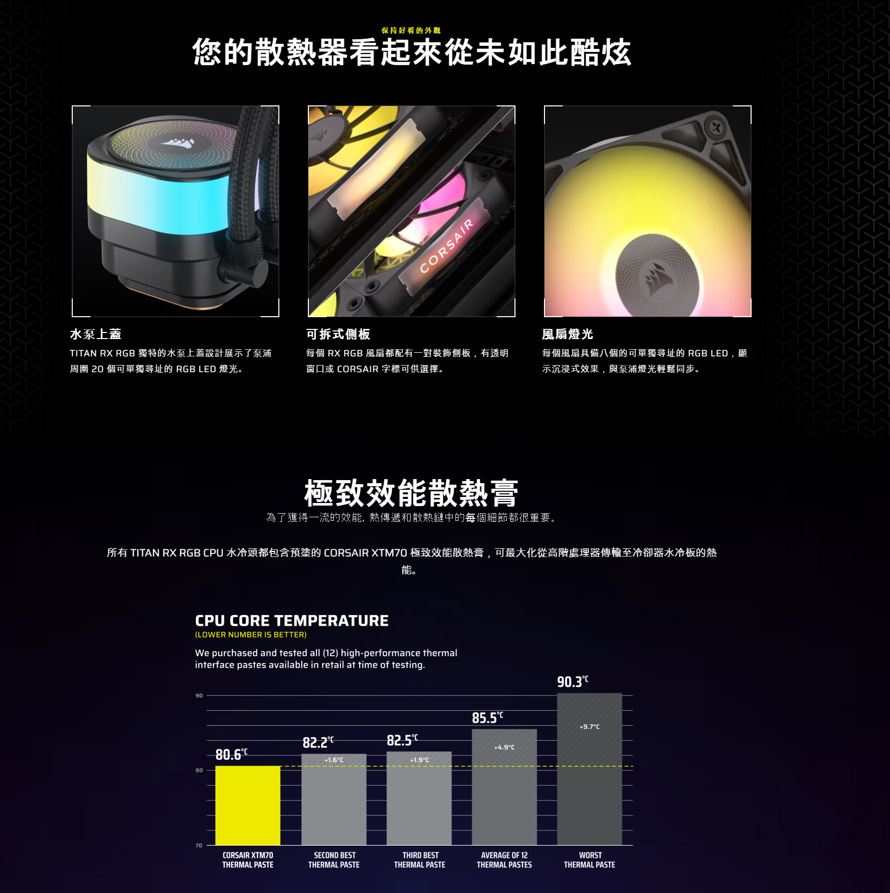 CORSAIR iCUE LINK TITAN RX RGB 以最佳化的熱性能、簡化的 iCUE LINK 連接能力和動態 RGB 燈光,提供高效能、超安靜的散熱效果。