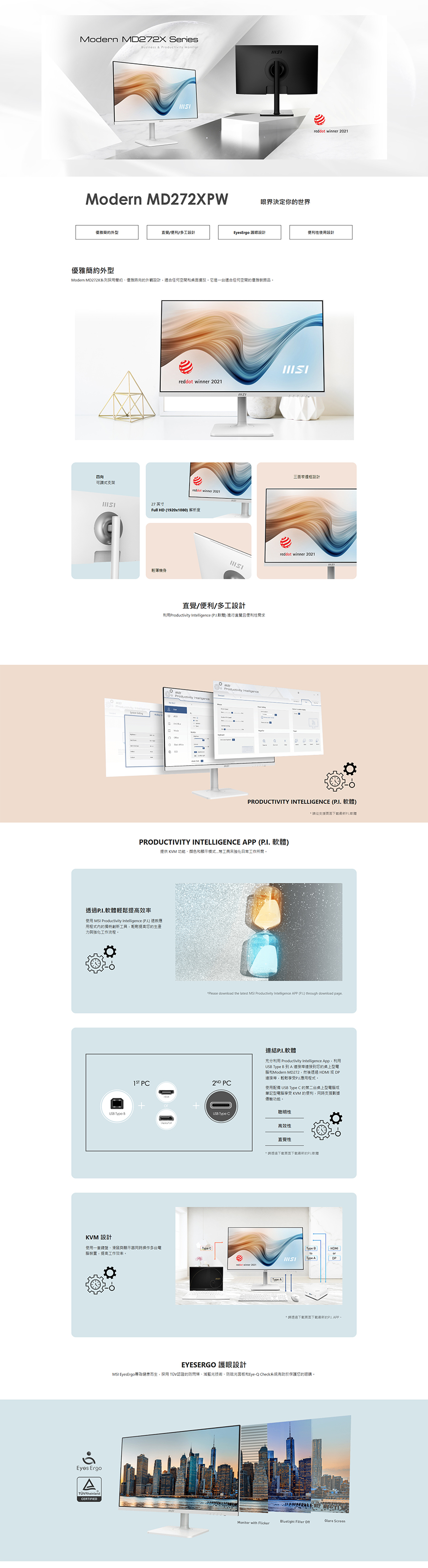 - KVM 功能透過一組鍵盤、滑鼠與 Modern MD272 系列顯示器無縫控制多個設備